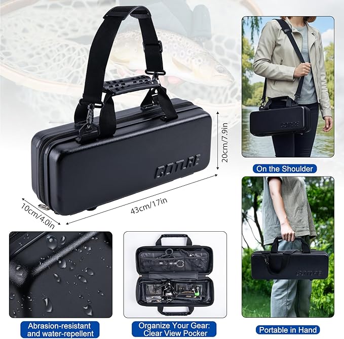 - 【Organized. Protected. Ready to Fish】The PC carry case features IPX4 waterproof protection, safeguarding your gear from light rain and splashes. Its interior is intelligently organized with clear, fixed compartments: a padded slot secures the rod and reel, a sealed section houses the tackle box, and mesh pockets hold pliers and scissors. Eliminate disorganization—access your gear in seconds.
