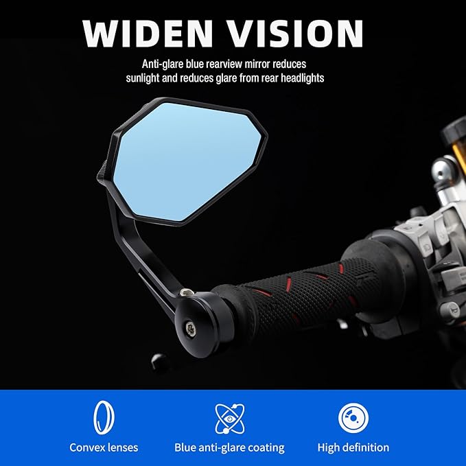 DREAMIZER Motorcycle Bar End Mirrors Black CNC Bar End Mirrors for Motorcycles Compatible with Honda Kawasaki Suzuki Scooter and More (Blue Glass Lens)