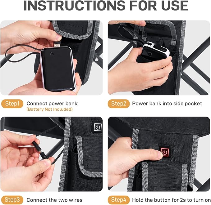 - 3 Heat Levels: The heated camping chair features USB-powered heating technology (battery not included). The heated chair offers three different heat levels to suit your comfort needs, quickly warms up your back and seat, with high heat reaching up to 131°F, medium heat at 113°F, and low heat at 95°F