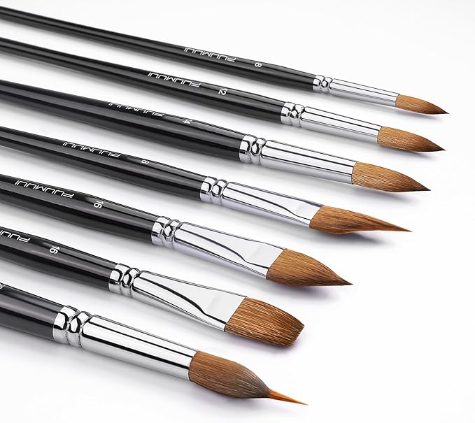 Watercolour Brushes Set, Fuumuui 7PCS Professional Kolinsky Sable Paint Brush with Patented Extended Points Design, Round, Flat, Oval, Mop for Fine Detail, Gouache, Ink, Watercolour Painting