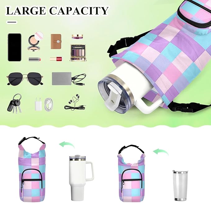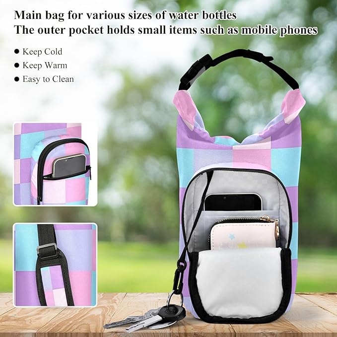 Purple Pink Checkered Water Bottle Holder with Strap Insulated Water Bottle Carrier Crossbody Bags Pouch with Phone Pocket for Travel Gym Hiking Walking Running