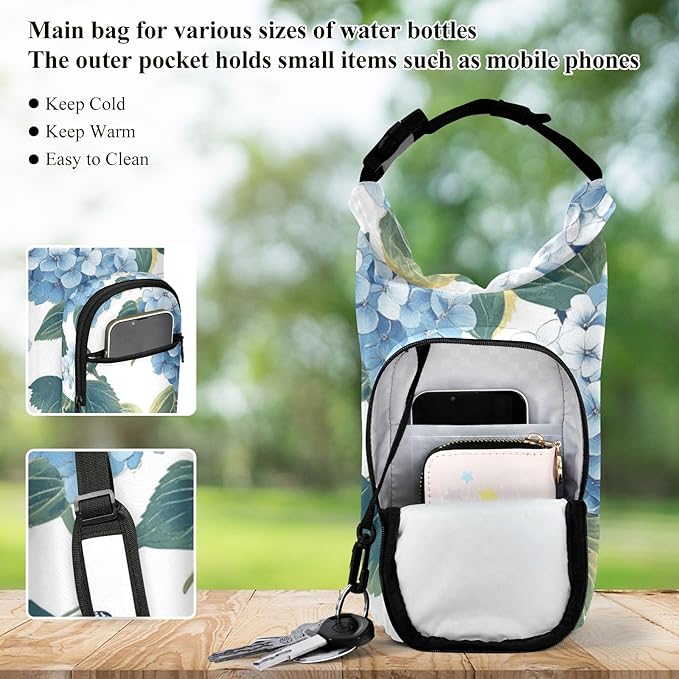 Blue Hydrangea Butterfly Water Bottle Holder with Strap Insulated Water Bottle Carrier Crossbody Bags Pouch with Phone Pocket for Travel Gym Hiking Walking Running