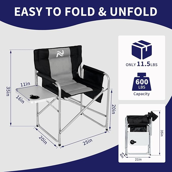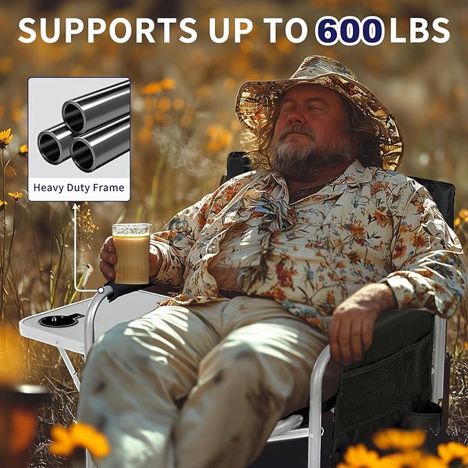 - Durable Construction: Crafted with a robust steel frame and high-density foam padding for superior lumbar support, this directors chair supports up to 600 lbs. Ensuring long-lasting performance in various outdoor environments